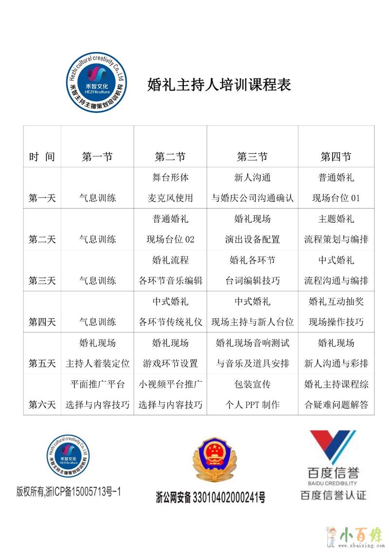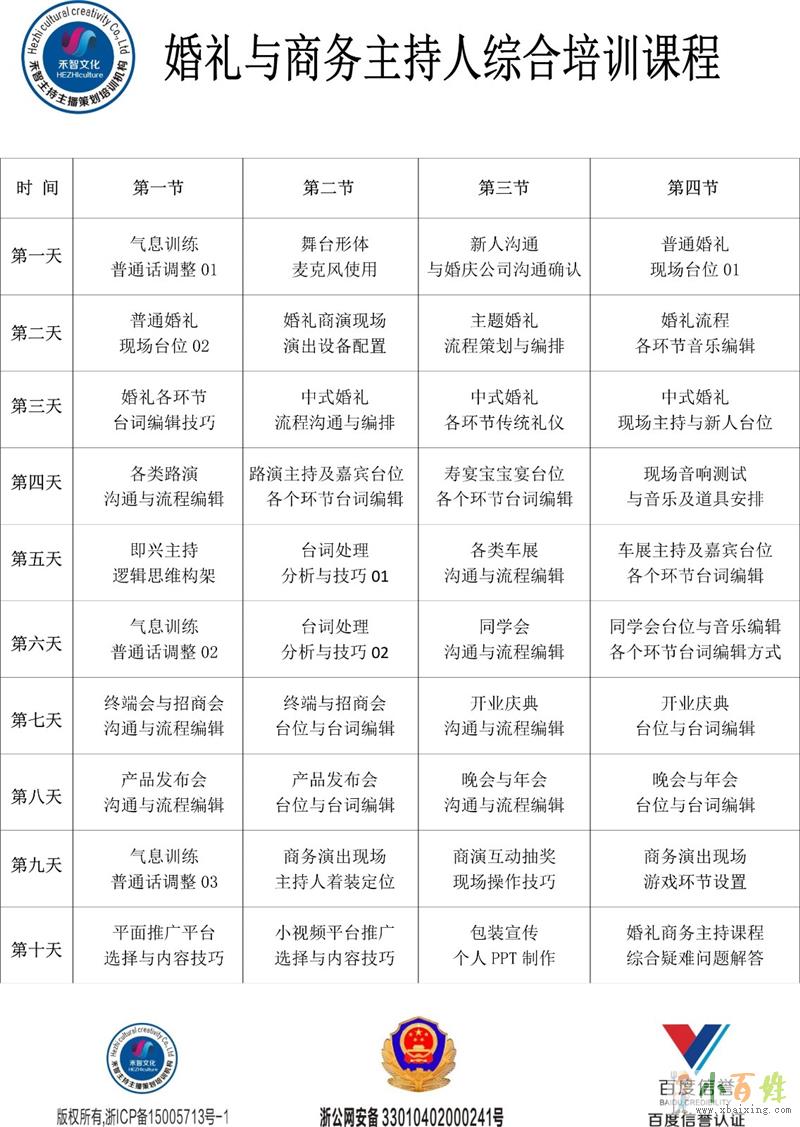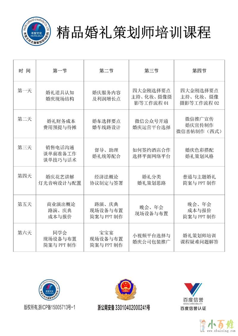 建立客户源等;培训内容:婚礼统筹,婚礼策划(色系与花艺的搭配,新人策划
